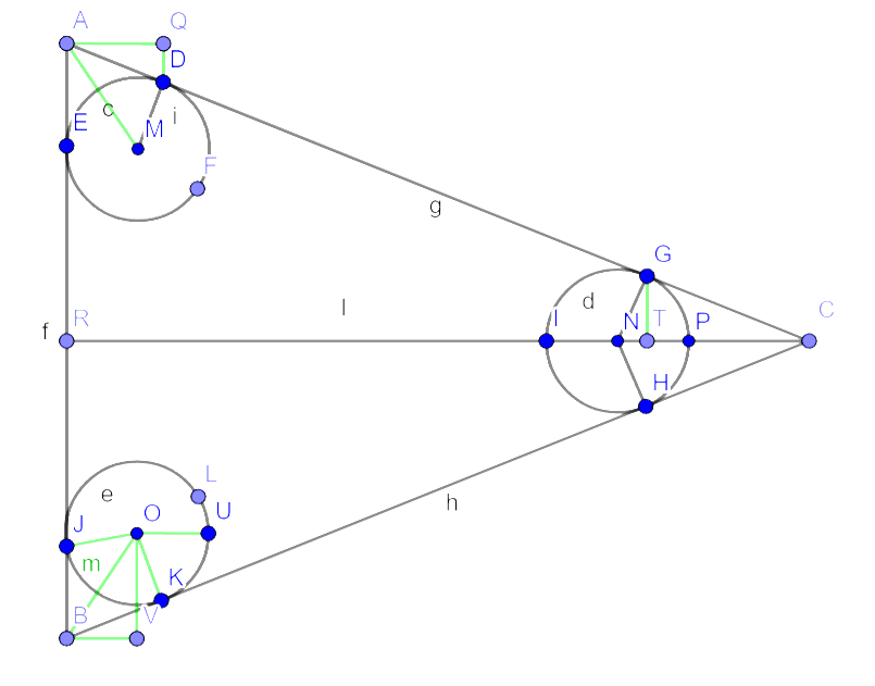 We also need coordinates of point O and two angles for arc function - ∠KOU and ∠JOK. In order to calculate BV and OV as x and y coordinates, we need to know hypotenuse BO and value of ∠OBV for right △BOV. It is worth noticing that ∠OBV is equal to the sum of ∠DAM and ∠DAQ because it lies on the opposite side of the isosceles triangle. Also, admit that hypotenuse BO for the △BVR is also hypotenuse for △BKO. Leg KO and angle ∠KBO are equal to roundRadius argument and ∠DAM angle. Let’s calculate BO within sine of angle as we did it before.